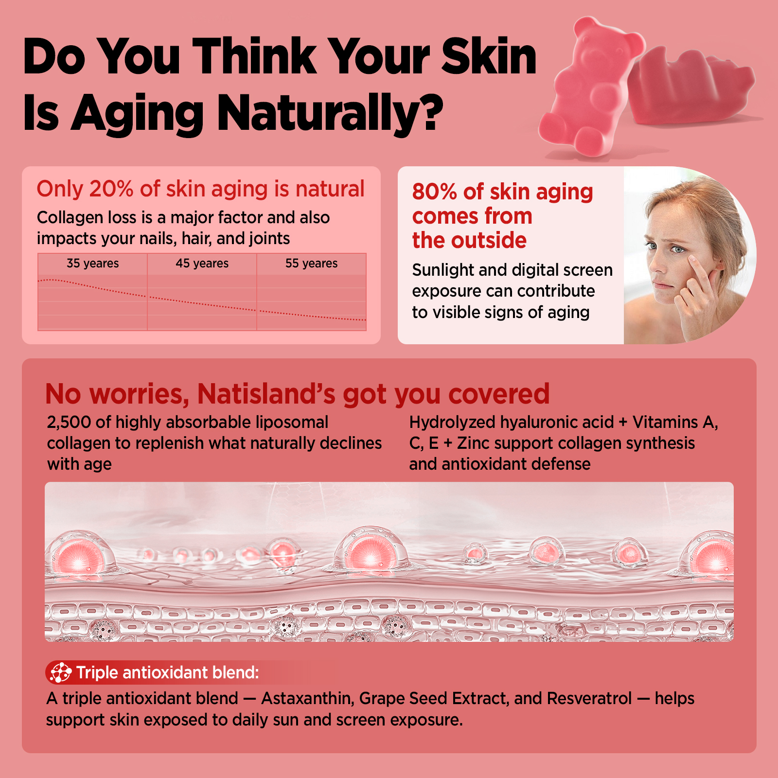 - ASTAXANTHIN + HYDRATION SUPPORT: Our antioxidant blend with astaxanthin, resveratrol, and grape seed extract helps protect against external factors. Hyaluronic acid, vitamin C, and zinc promote hydration and natural renewal—making these collagen gummies a complete skin support formula