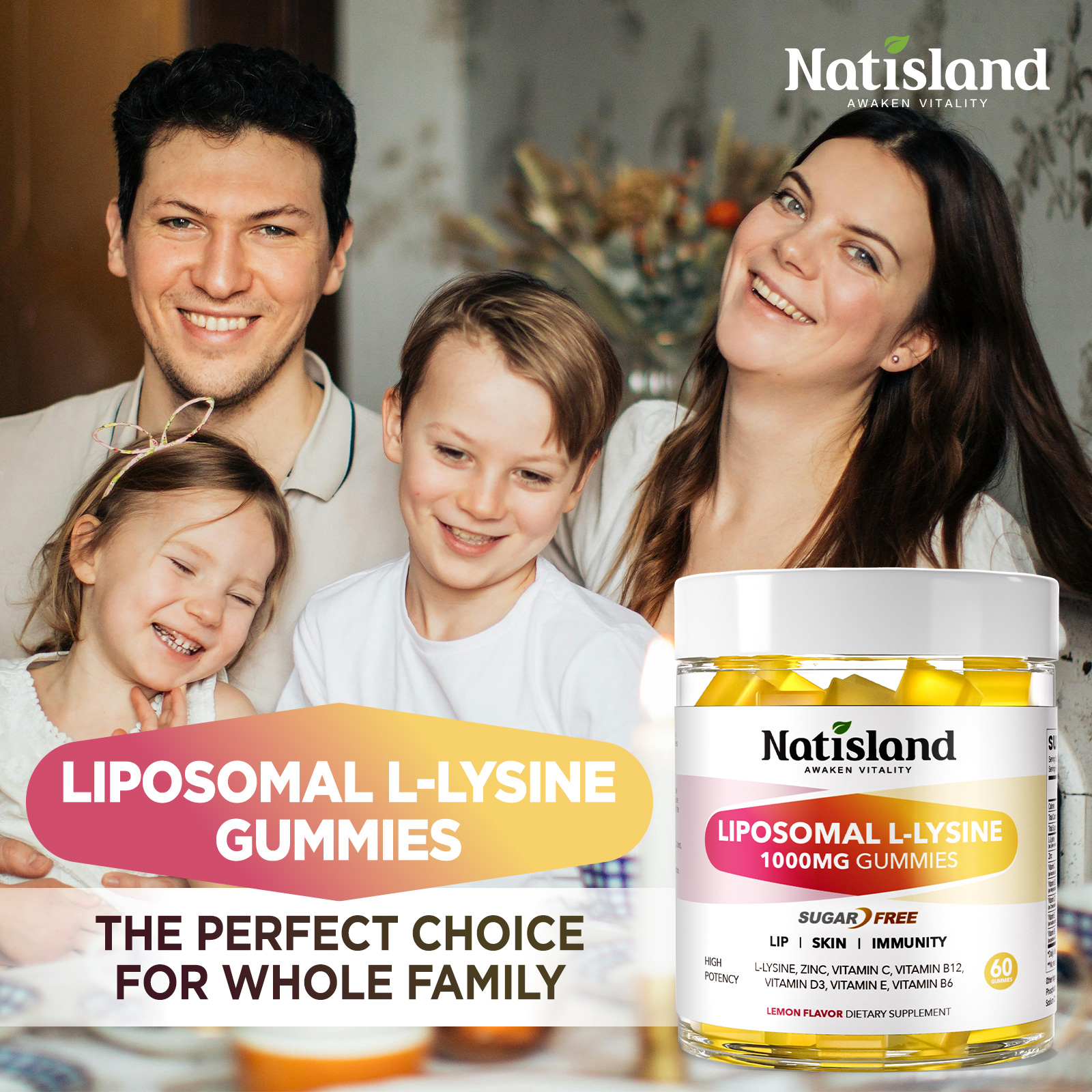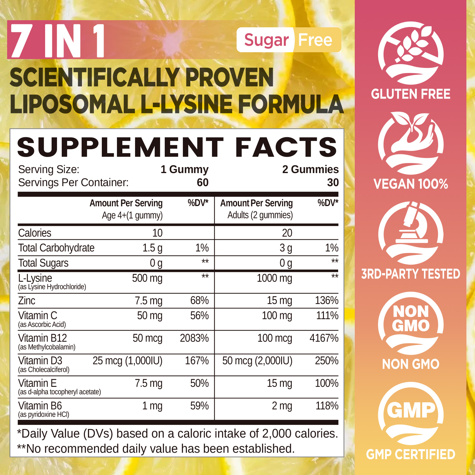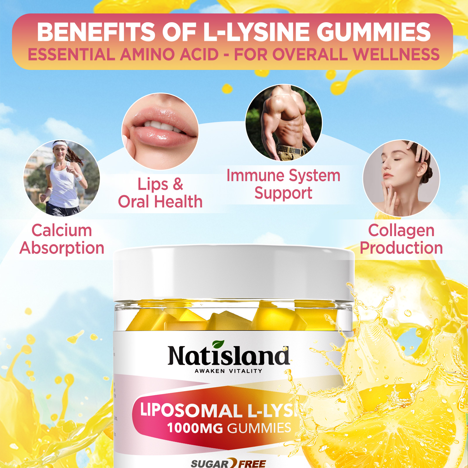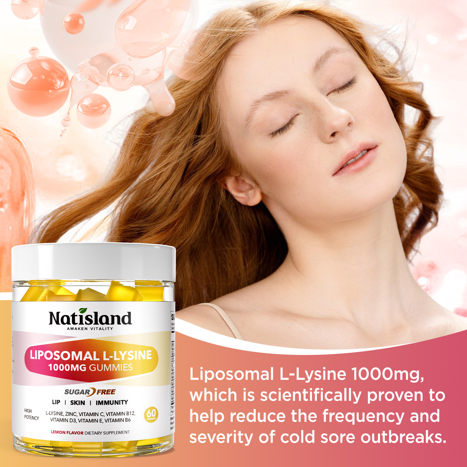 • L-Lysine 1000mg Gummies: Each 2 lysine gummies deliver 1000mg of l lysine to support healthy immune function, lips and skin wellness. Combined with zinc and vitamin c, b12, d3, b6 & e, our lysine chewable supplement provides a balanced formula for comprehensive wellness