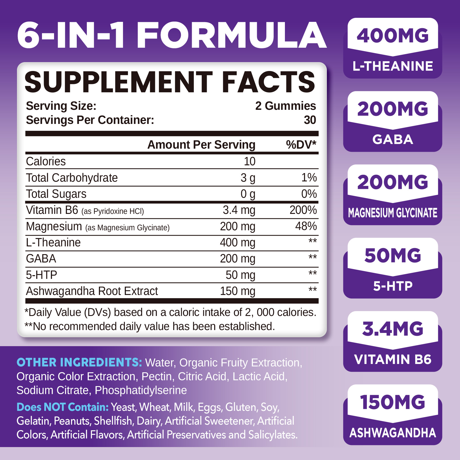 - 6-In-1 Blend Formula: L’theanine, sourced from natural green tea leaves, is well-known for promoting relaxation and focus. Our l-theanine 400mg gummies are combined with gaba 200mg, 5-htp 50mg, ashwagandha 150mg, magnesium glycinate 200mg, and vitamin b6 3.4mg