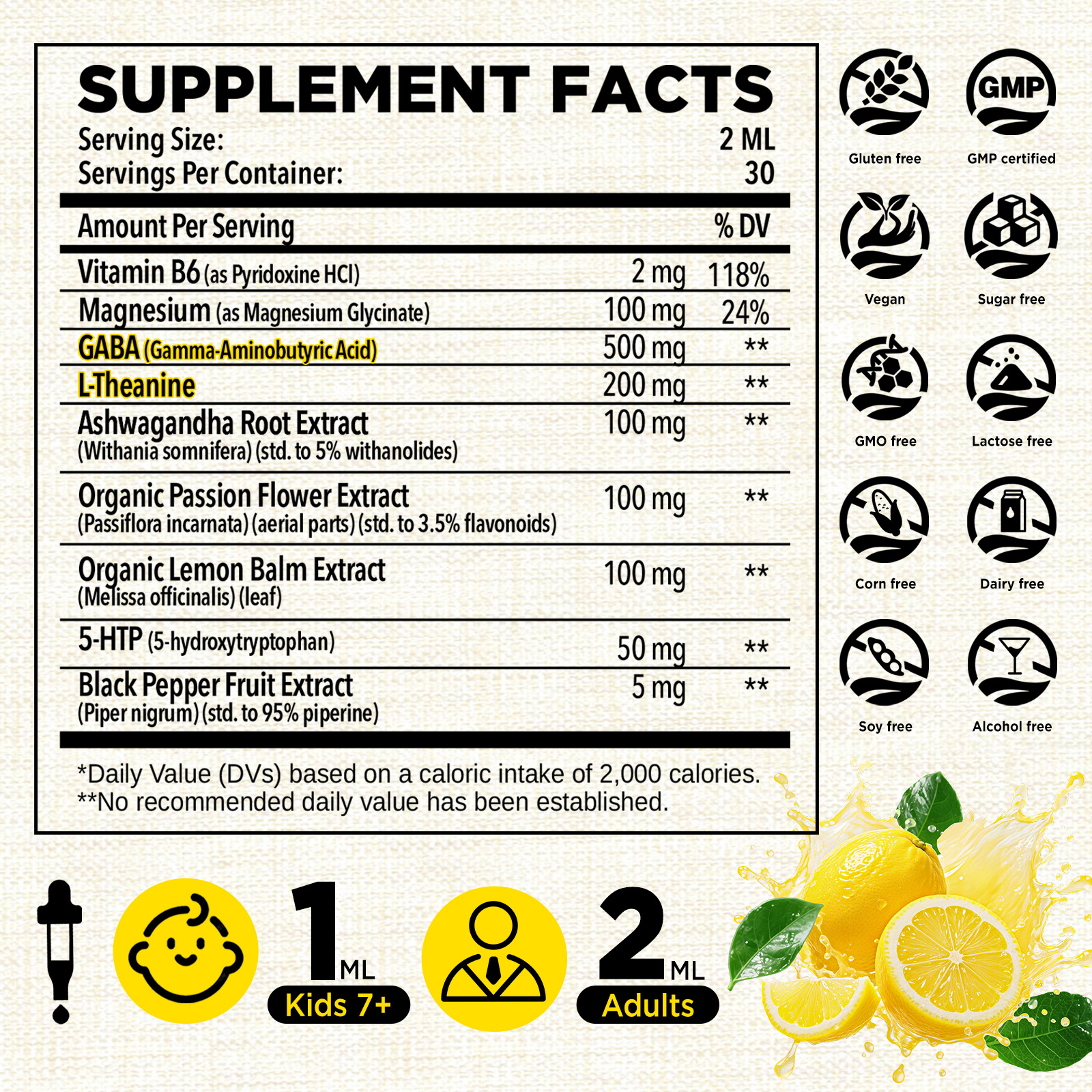 Liposomal GABA with L-Theanine Liquid Drops, GABA L-Theanine Supplement for Adults & Kids, Ashwagandha, Magnesium Glycinate, Vitamin B6, for Relaxation & Stress Relief, Lemon Flavor, 2 Fl Oz
