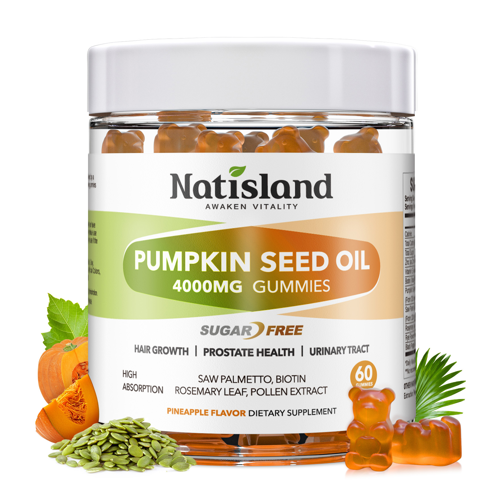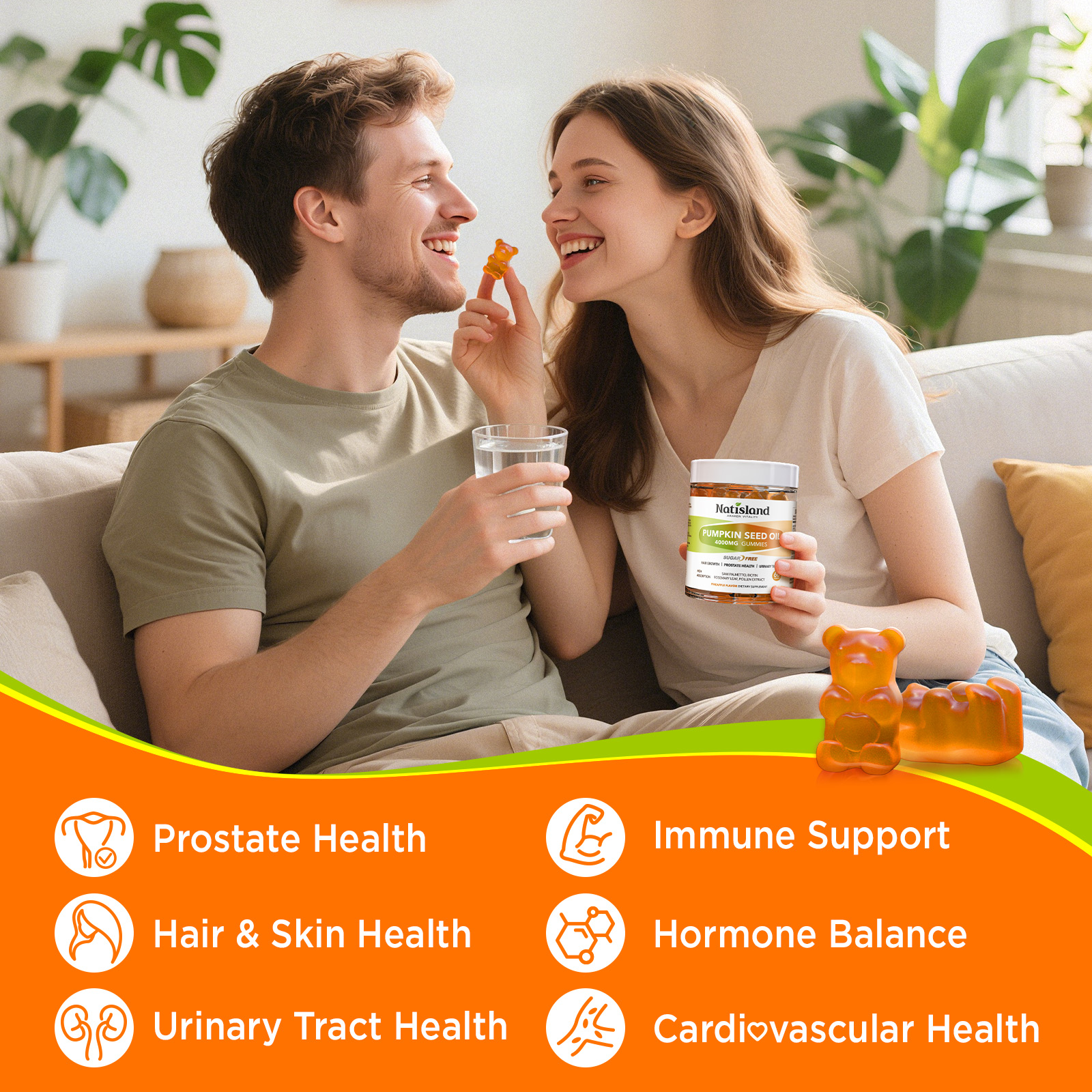 - PUMPKIN SEED OIL SUPPLEMENT: Our pumpkin seed oil gummies are known for their rich source of essential fatty acids, phytosterols, and antioxidants. This 8-in-1 formula supports prostate, urinary tract, and hair health, offering daily wellness support for both men and women