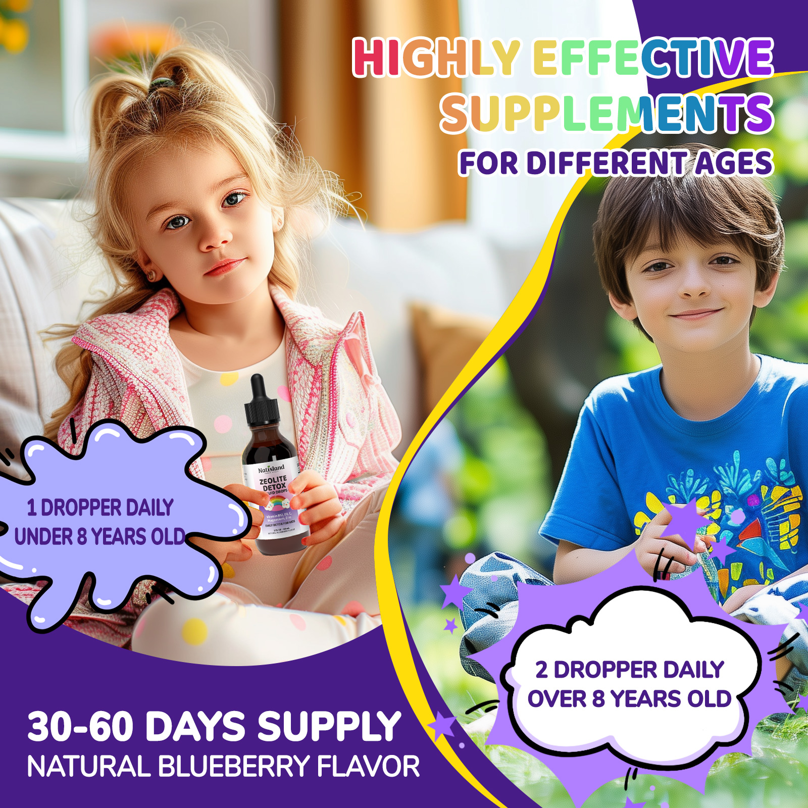 - Clear Dosage for Kids: NATISLAND support two different dosages for under 8 years old and over 8 years old, more suitable for different ages children to choose different dosages for daily, only need 1-2 drops to be used per day. Helps with daily detoxification and overall health